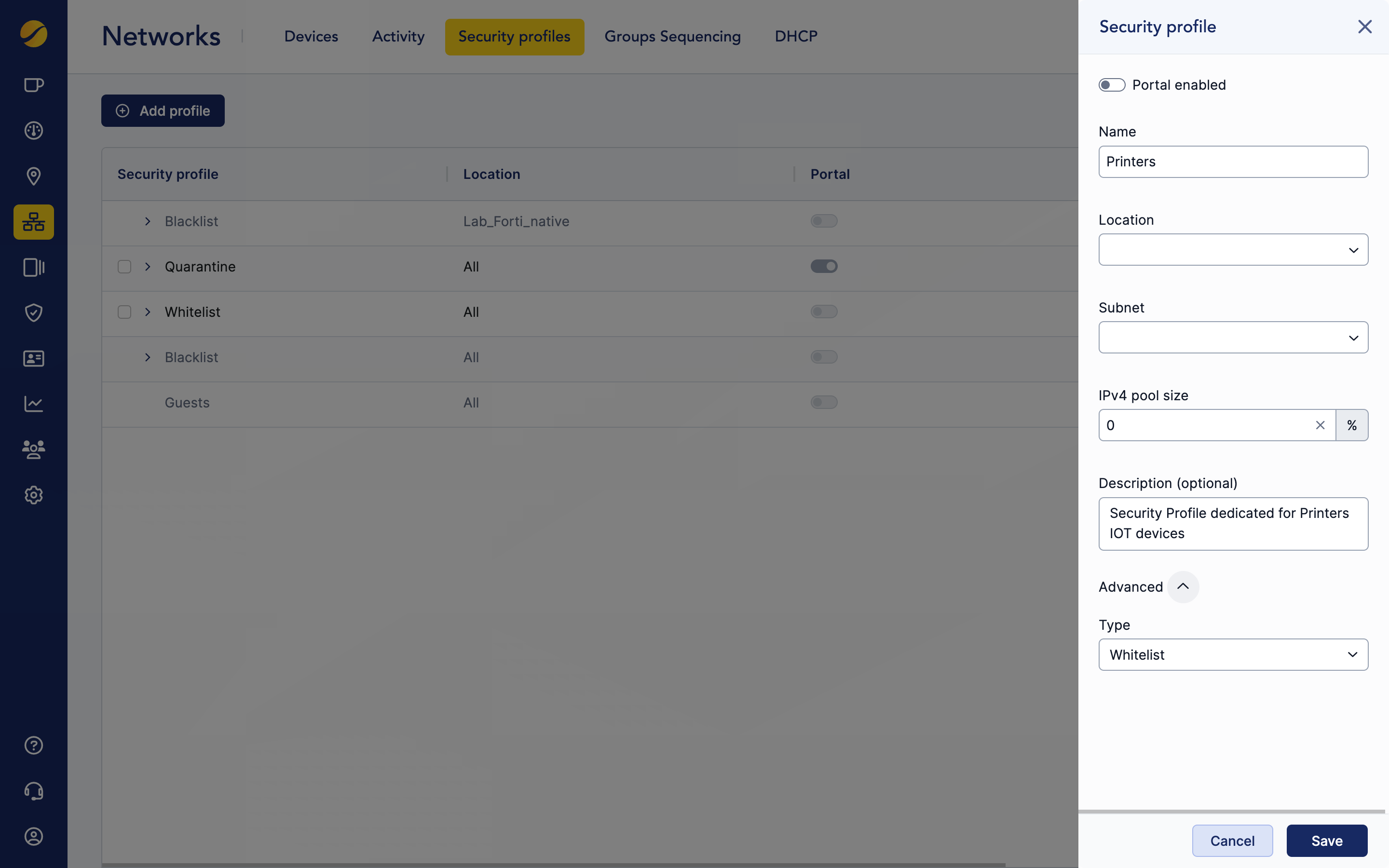 Security Profiles are particularly useful for creating Meraki-side policies tailored to the different IoT profiles present on your network. For example, you could create a Security Profile dedicated to printers, and on the Meraki side, allow access only to specific ports or destinations for that profile.