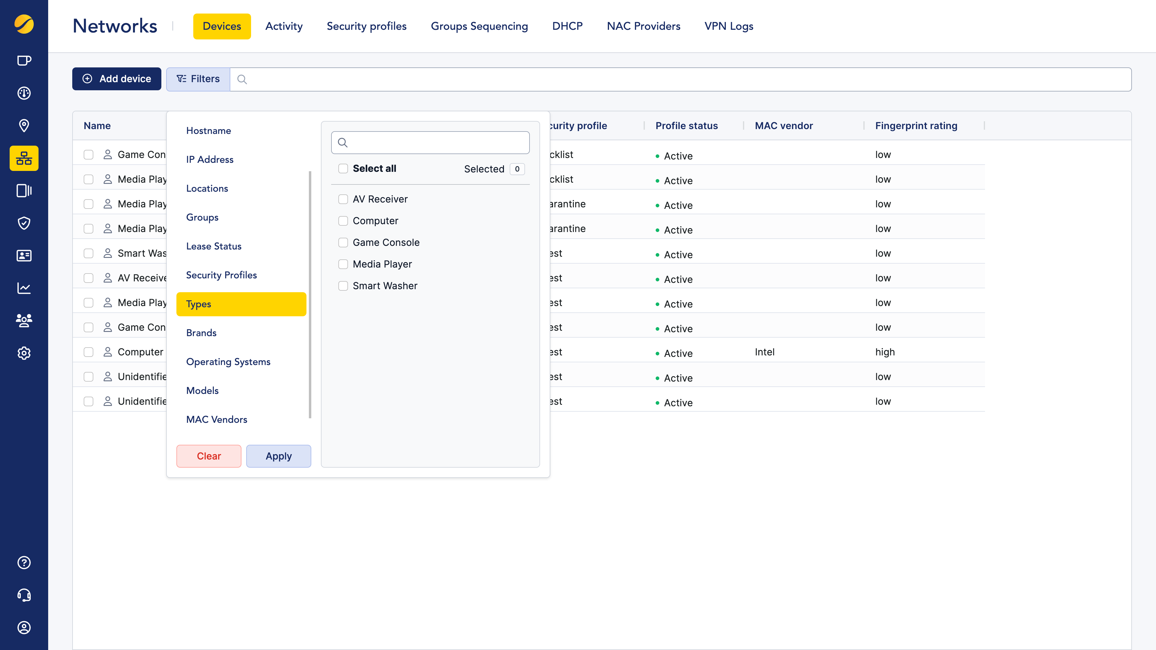 A dedicated device search module is now available, enabling administrators to precisely locate any device on the network using a wide range of filters (Device Name, IP Address, Hostname, Device Brand, DHCP Lease Status, Locked IP, MAC Address). This makes it significantly faster to find, inspect, and manage individual devices, especially in large-scale deployments.