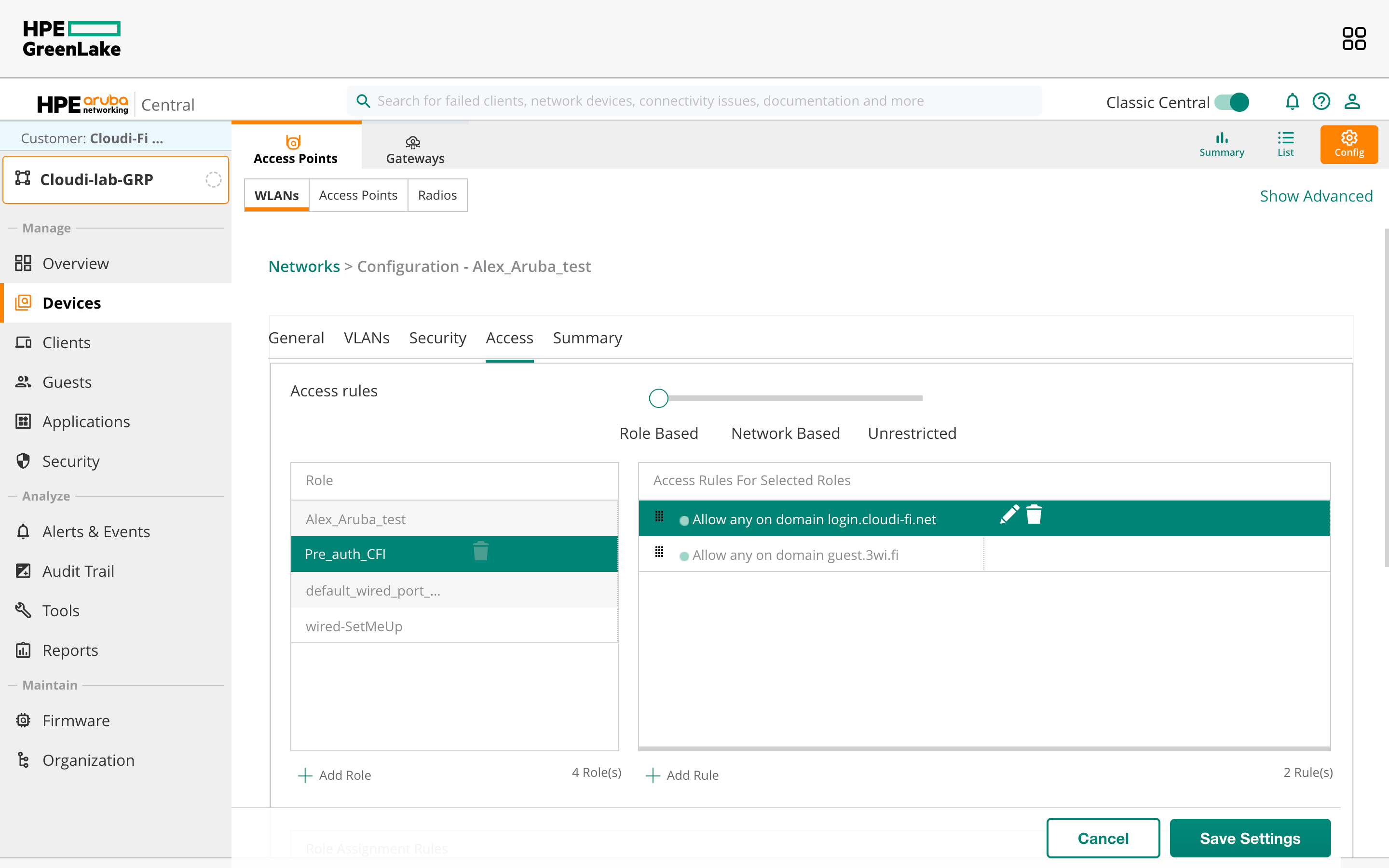 This guide provides step-by-step instructions for integrating the Cloudi-Fi captive portal with Aruba Central Network. This setup enables Radius-based user authentication, ensuring a secure and seamless network access experience.