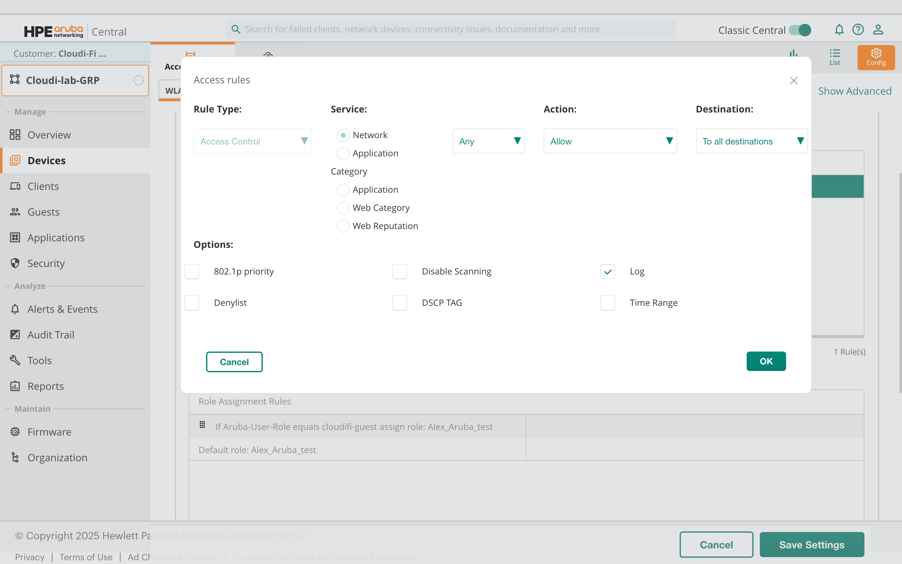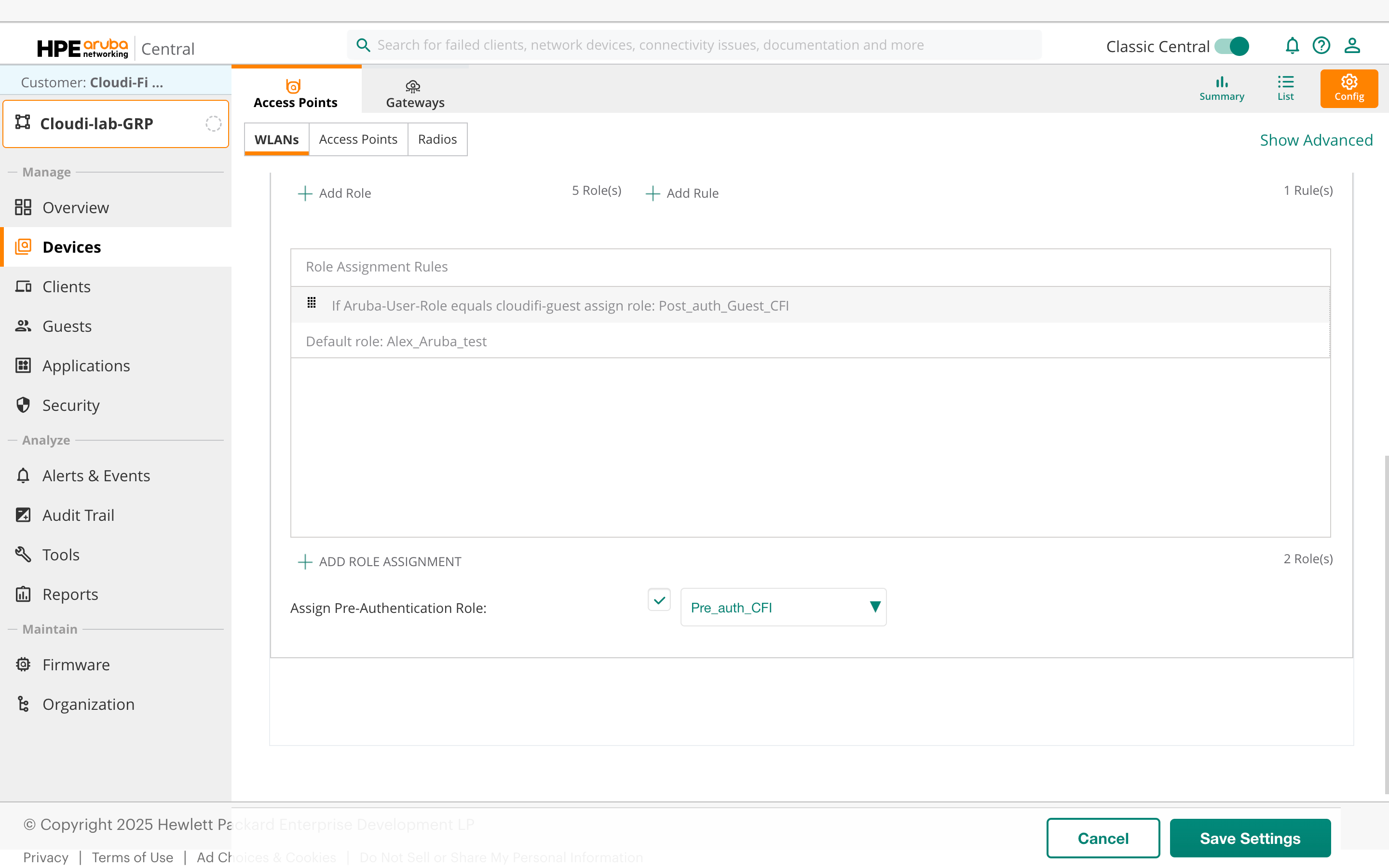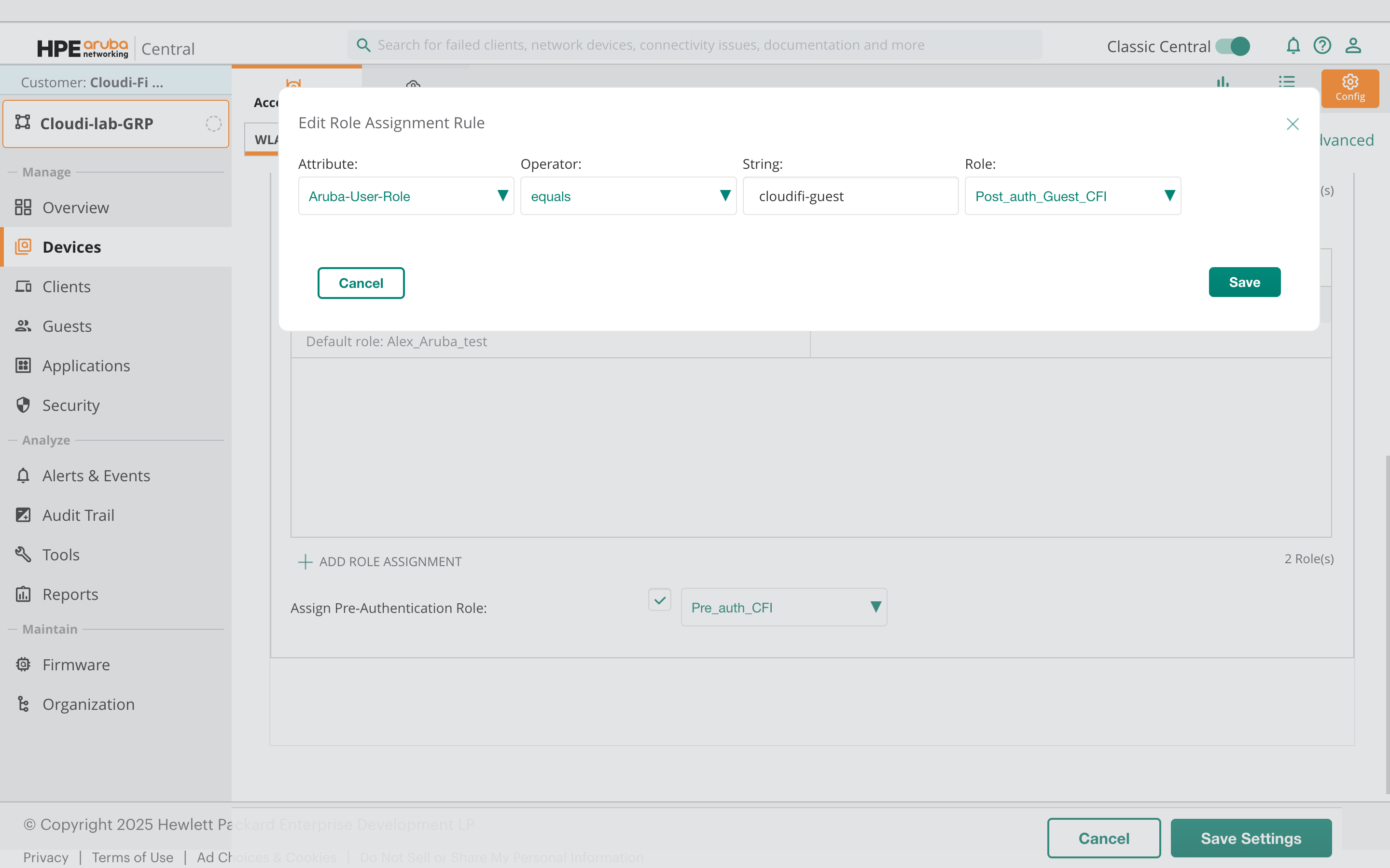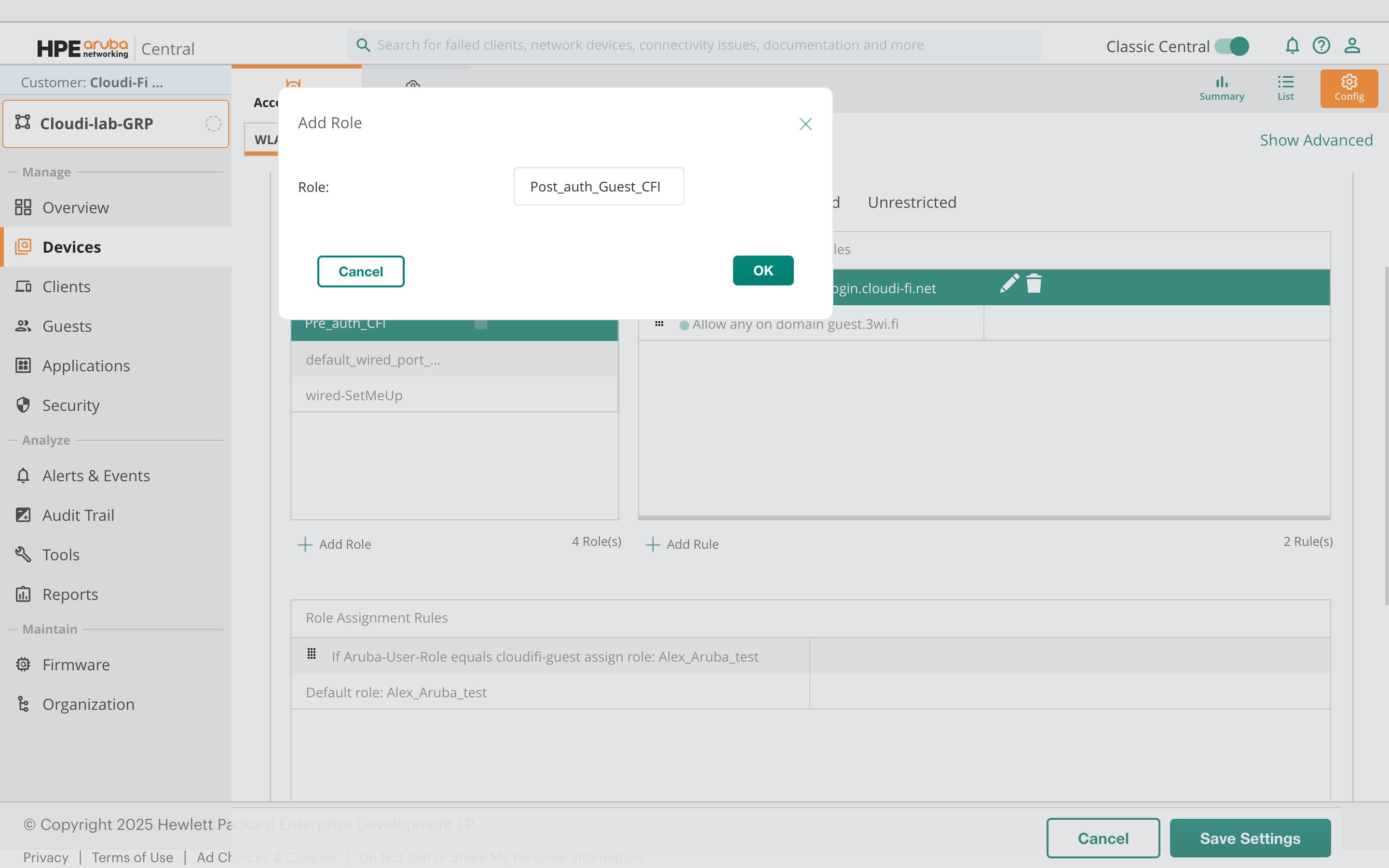 Cloudi-Fi facilitates administrators in defining user profiles, which can be seamlessly shared with Aruba Central via the Radius filter ID. This integration empowers administrators to establish customised roles and policies tailored to different user types. For example, two Role Assignment Rules can be implemented to assign the "Guest" or "Employee" role to users who connect through the captive portal. Employees may require access to specific applications or resources, while the Guest group may need limited privileges. With Aruba Central, administrators can create customized roles and policies for each group, ensuring that users have the appropriate level of access to network resources.
