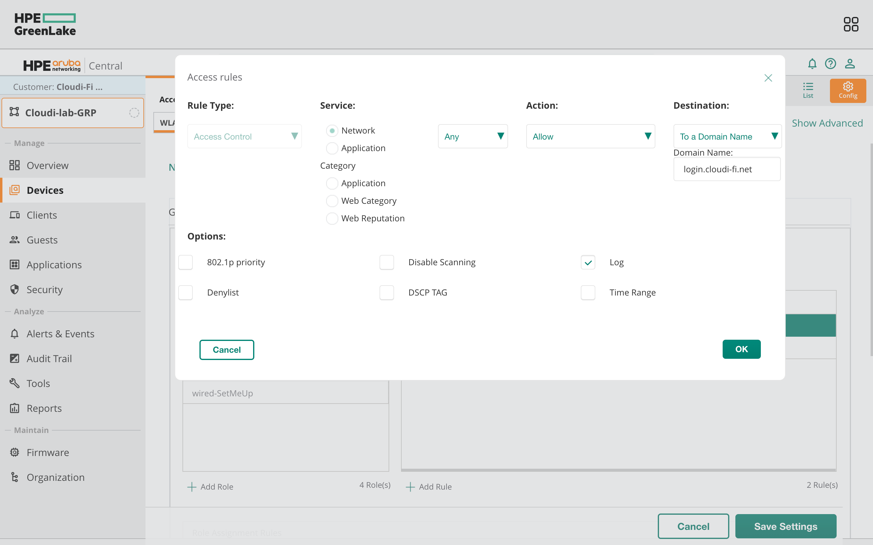- Click on "Your_Group" > Device > Config > WLANs > Access > Rule